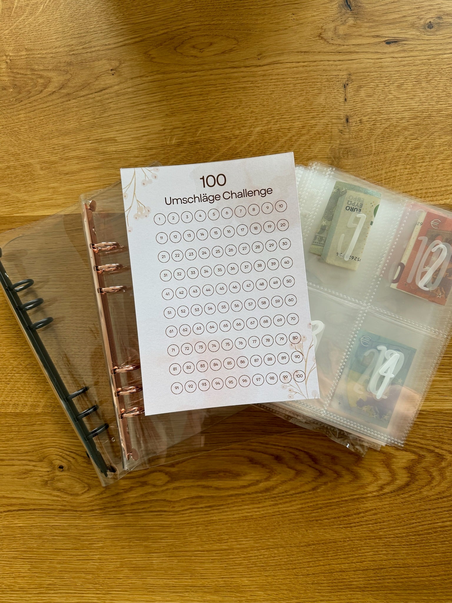Du erhälst beim kauf 25 nummerierte Umschläge von 1-100, einen Tracker inkl. Budgte Sheet und wahlweise einen Binder dazu. Alles ist in der größe A5.