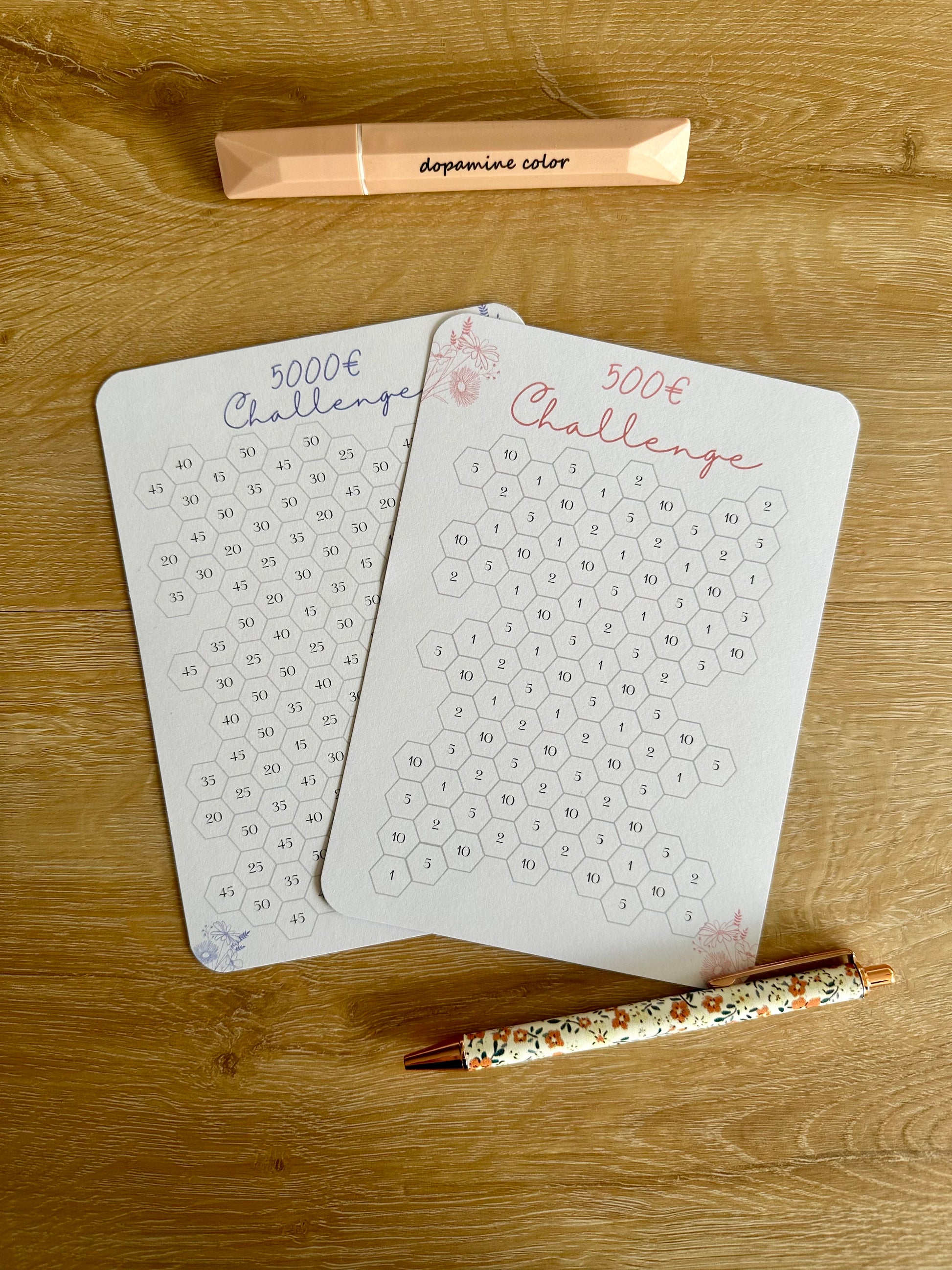 Entdecke unsere 500€ und 5000€ Spar-Challenge! Auf der Rückseite jeder Challenge ist ein passendes Budegt Sheet zu tracken deiner Ausgaben. Die Challenge passt perfekt in deine A5 Hülle.