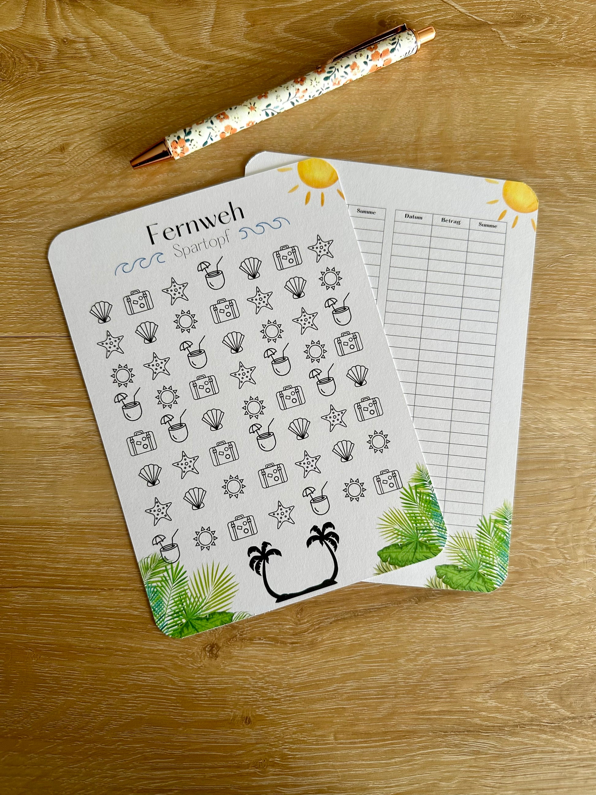 Der Fernweh Spartopf ist eine großartige Möglichkeit, um Geld für deinen nächsten Urlaub zu sparen und deine Reiseträume zu verwirklichen. Du kannst entweder pro Symbol einen festen Betrag sparen oder die Beträge, die du in den Umschlag steckst, tracken.