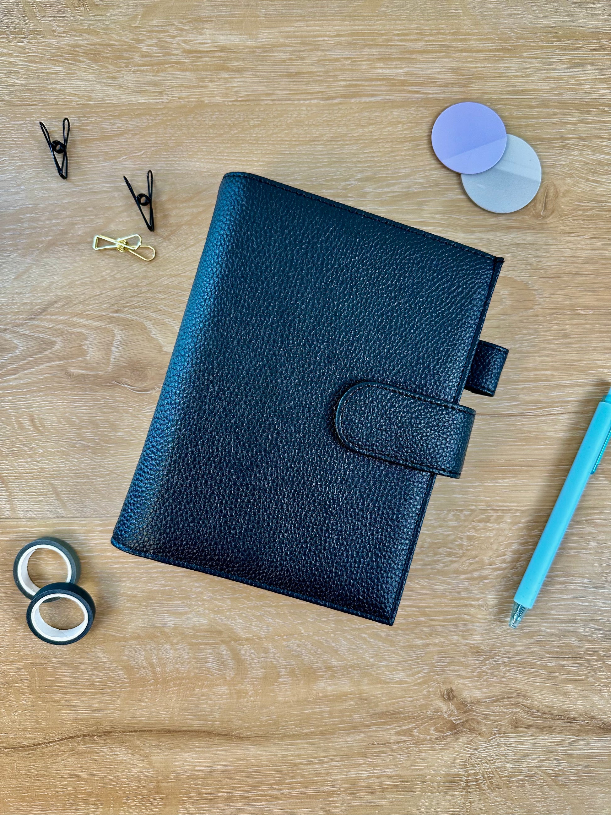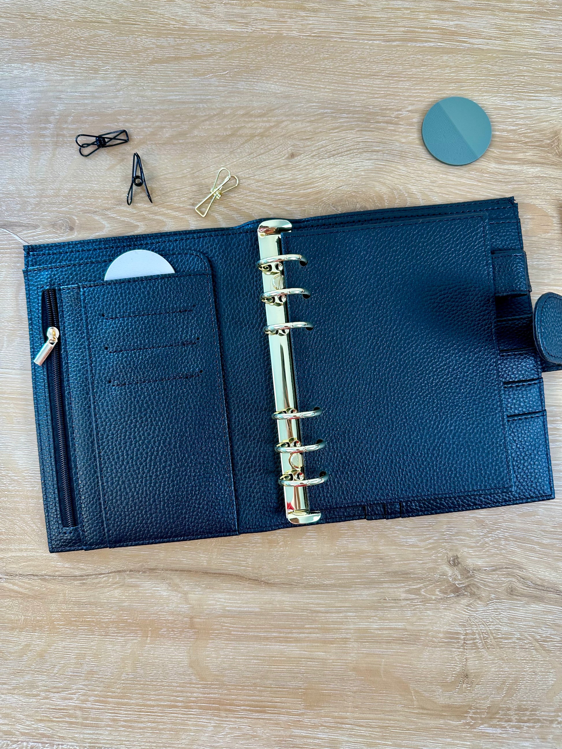 Unsere hochwertigen A6 Ringordner sind mit einem Magnetverschluss ausgestattet und verfügen über eine langlebige 25 mm Ringmechanik, die ausreichend Platz für Planereinlagen, Zipperhüllen oder Budget-Tracker bietet. Die vorgestanzte Einlage sorgt für sofortige Einsatzbereitschaft – ganz wie auf den Produktbildern zu sehen.
