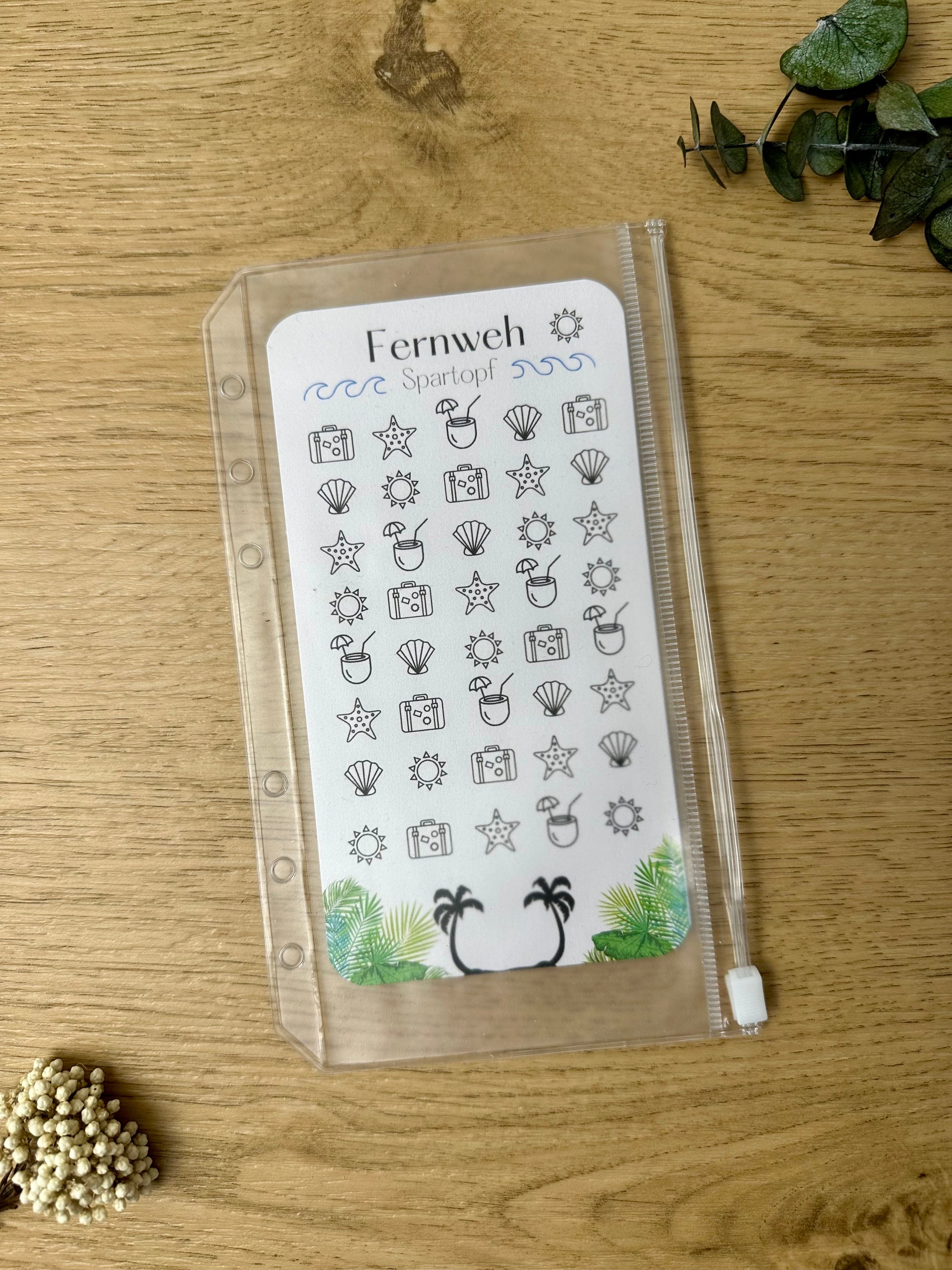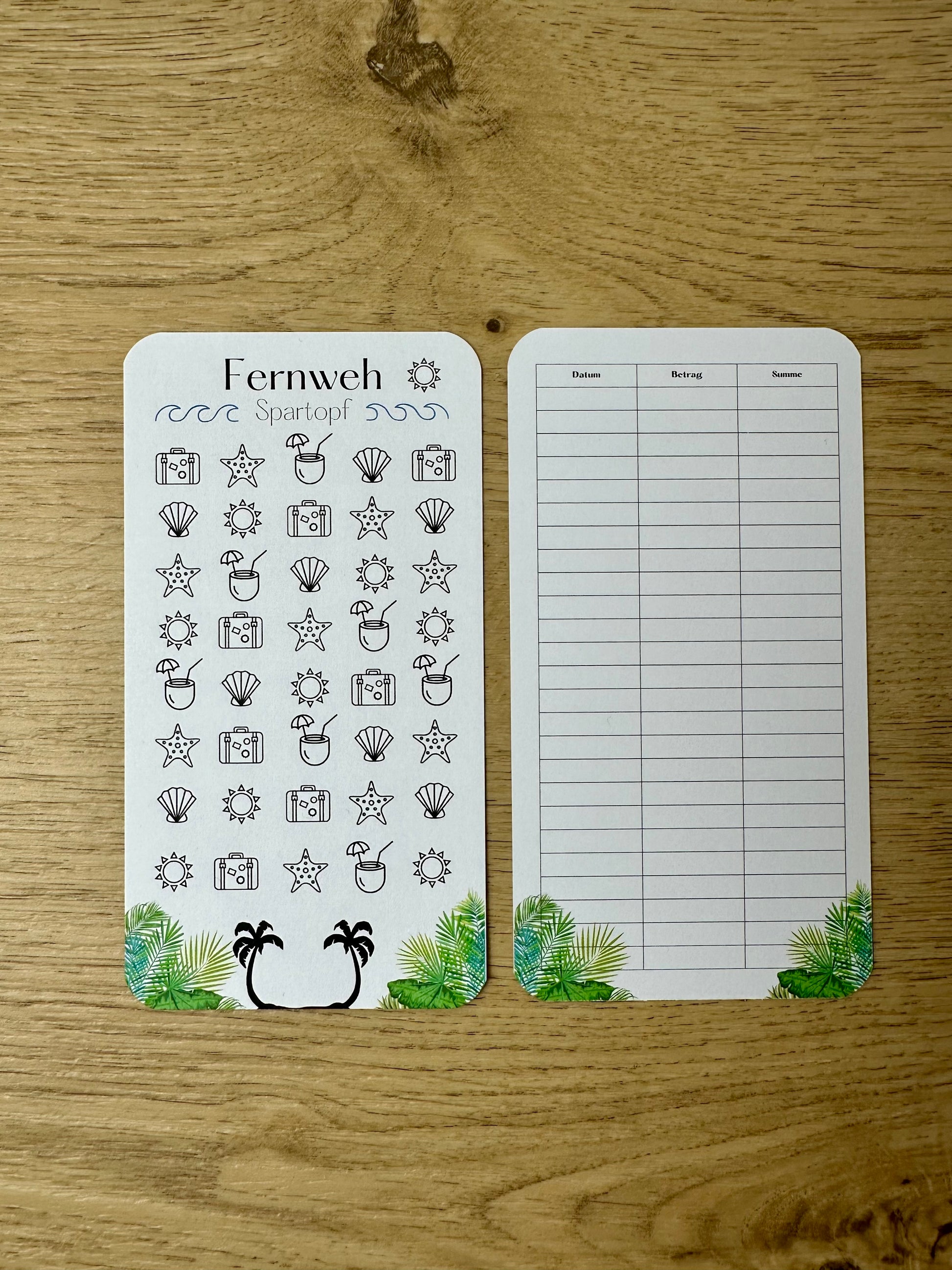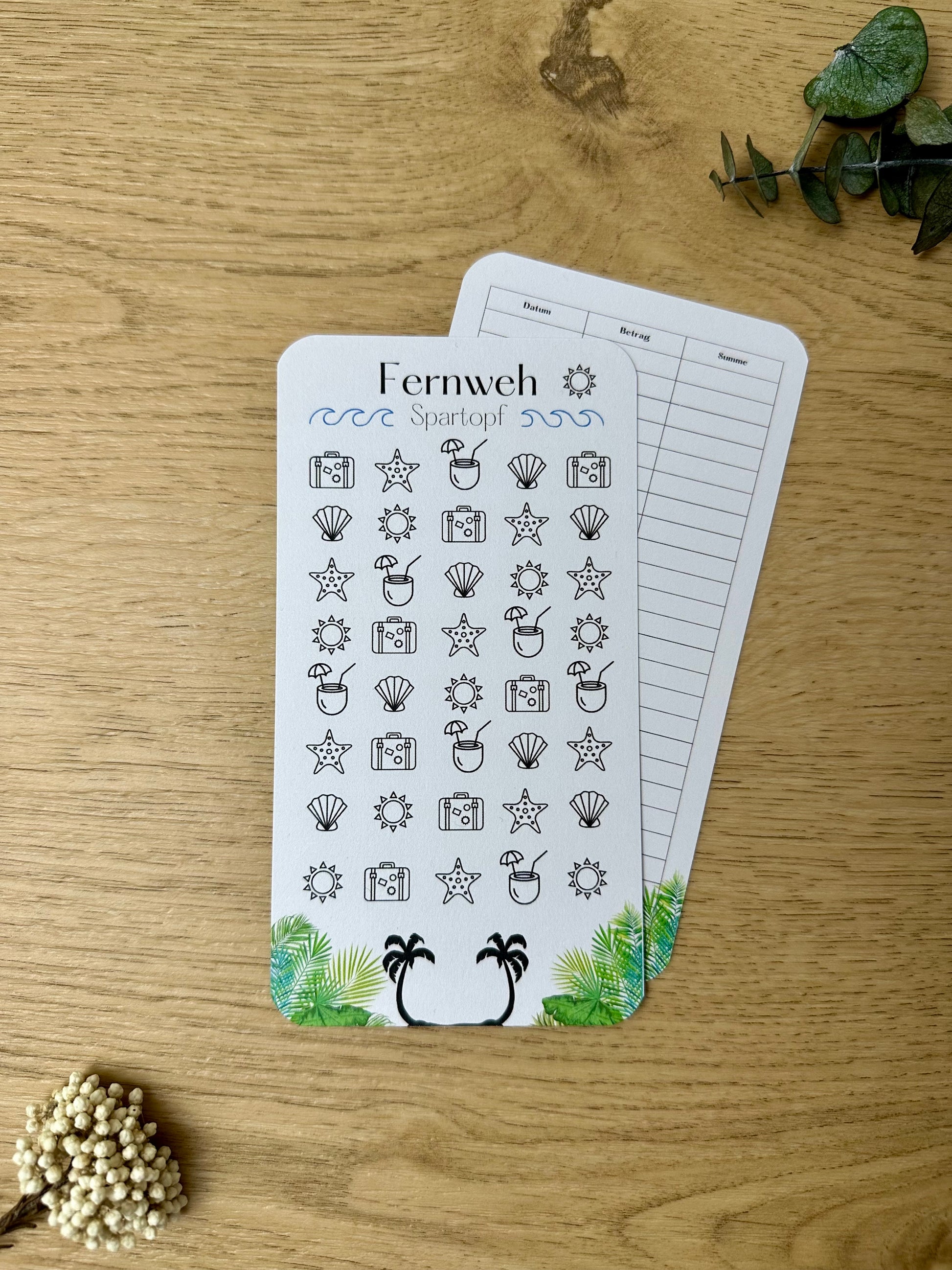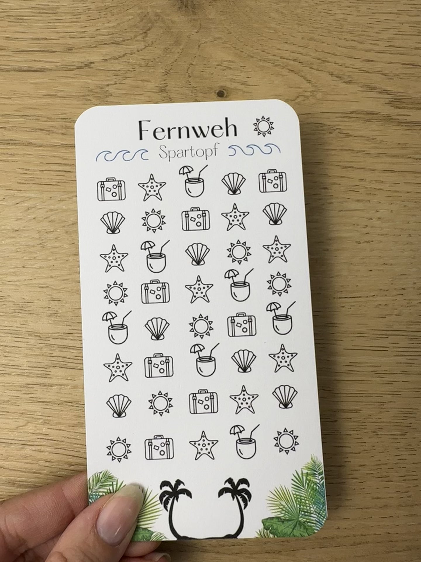 Der Fernweh Spartopf ist eine großartige Möglichkeit, um Geld für deinen nächsten Urlaub zu sparen und deine Reiseträume zu verwirklichen. Du kannst entweder pro Symbol einen festen Betrag sparen oder die Beträge, die du in den Umschlag steckst, tracken.