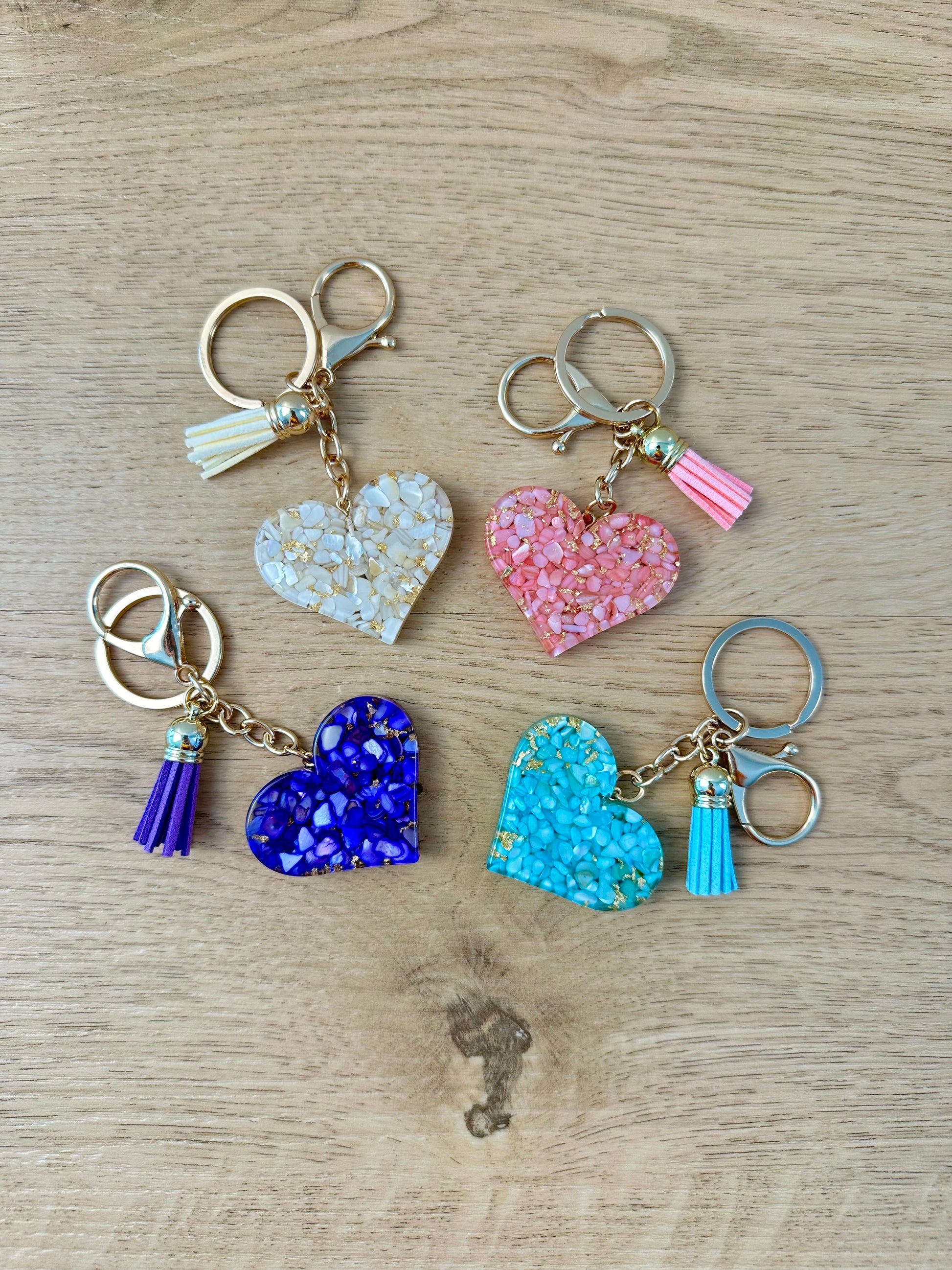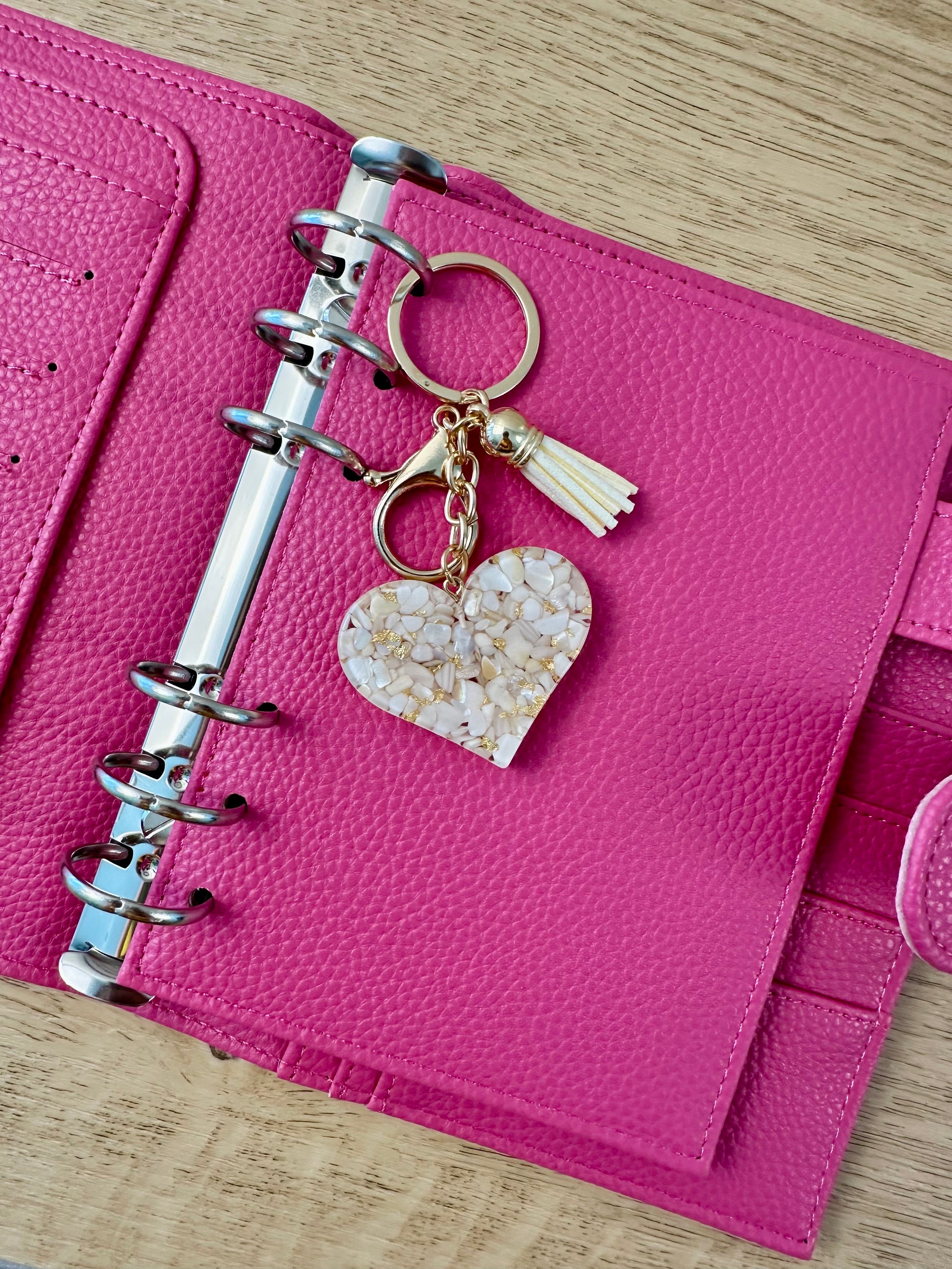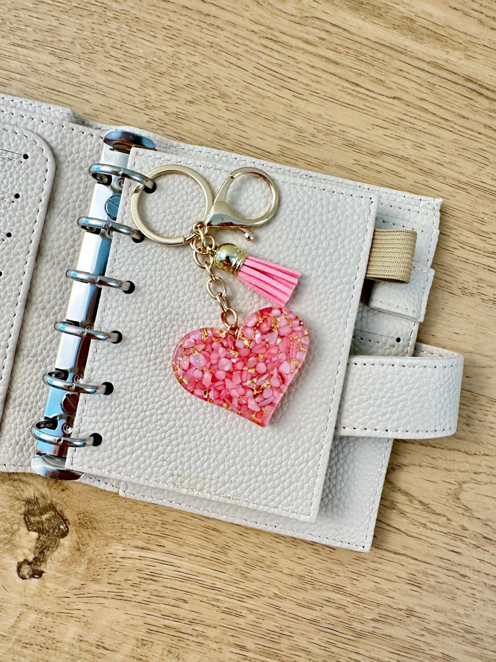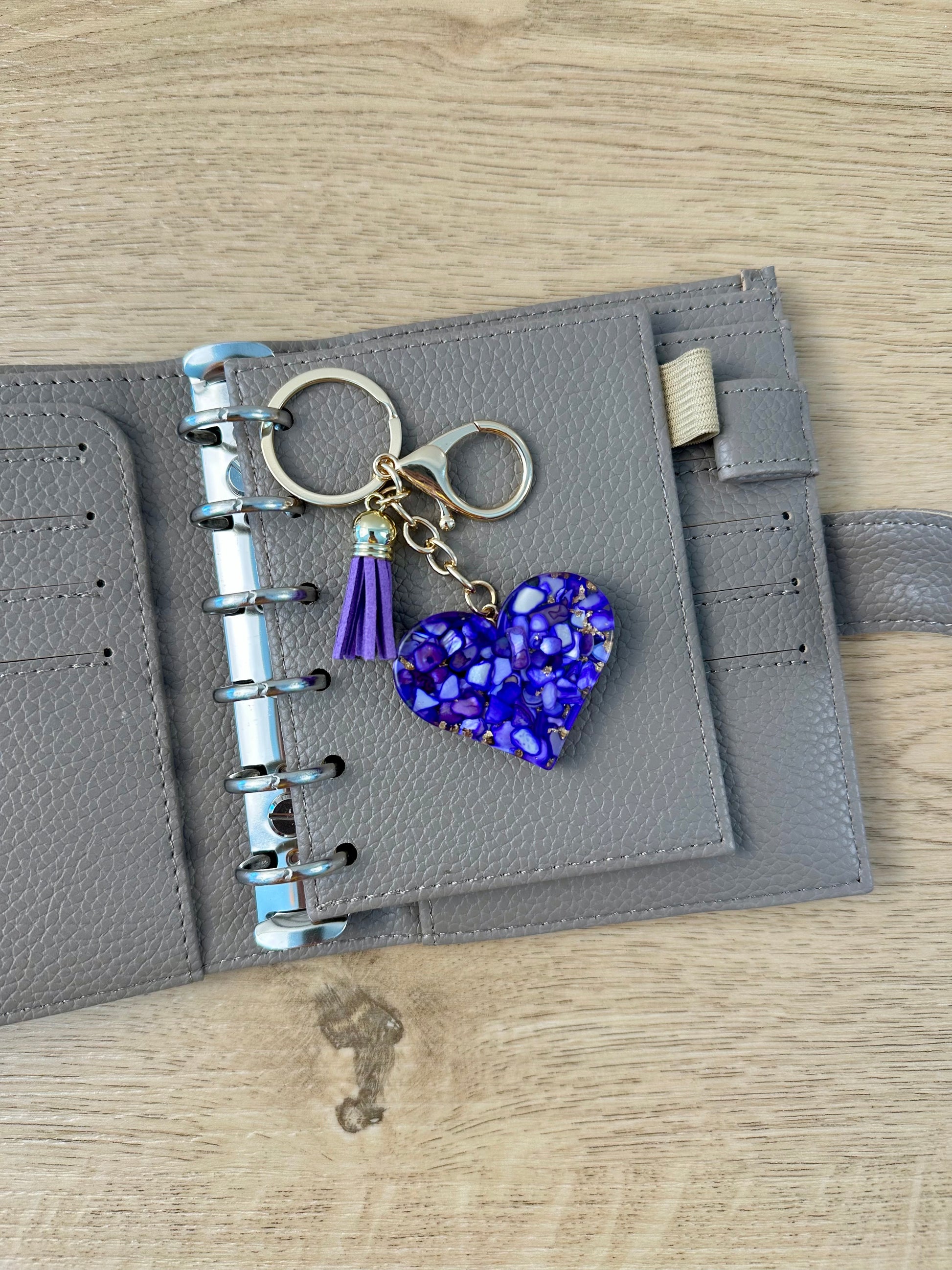 Verleihe deinem Budget Binder, Schlüsselbund, deiner Tasche oder deinem Auto eine elegante Note – mit unseren zauberhaften Herz-Anhängern in vier traumhaften Farbkombinationen! Jeder Anhänger ist ein kleines Schmuckstück, gefertigt aus gold-acryliertem Herz und farblich passenden Denksteinen, verziert mit einer weichen Quaste und an vergoldetem Schlüsselring plus Karabiner.