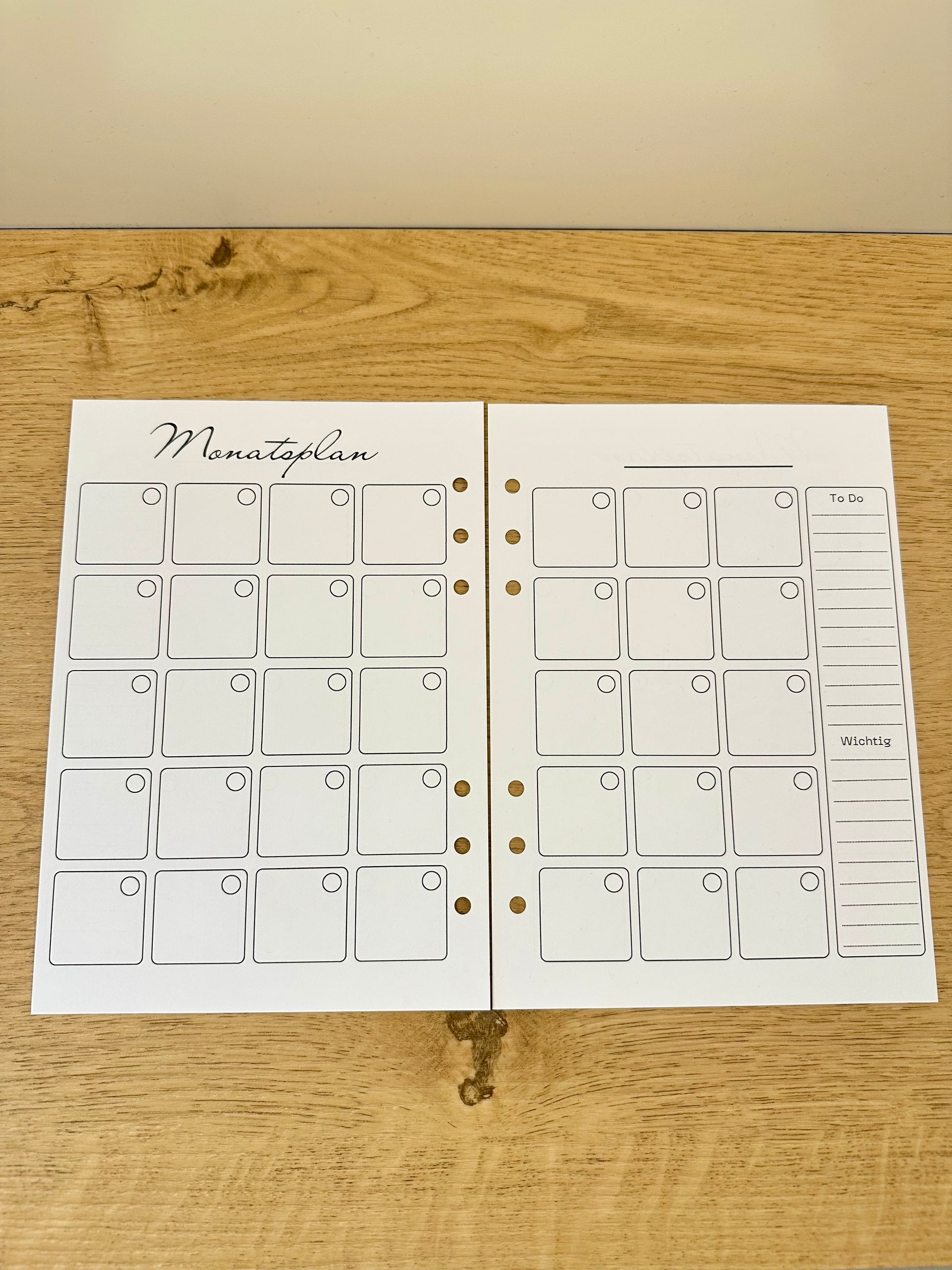 Behalte den Überblick über den ganzen Monat – mit unserer strukturieren Monatsübersicht im A5-Format. Ob für Termine, Projekte oder persönliche Ziele: Diese Einlage hilft dir, deine Zeit auf Monatsbasis effizient zu planen und dabei das Wichtige im Blick zu behalten.