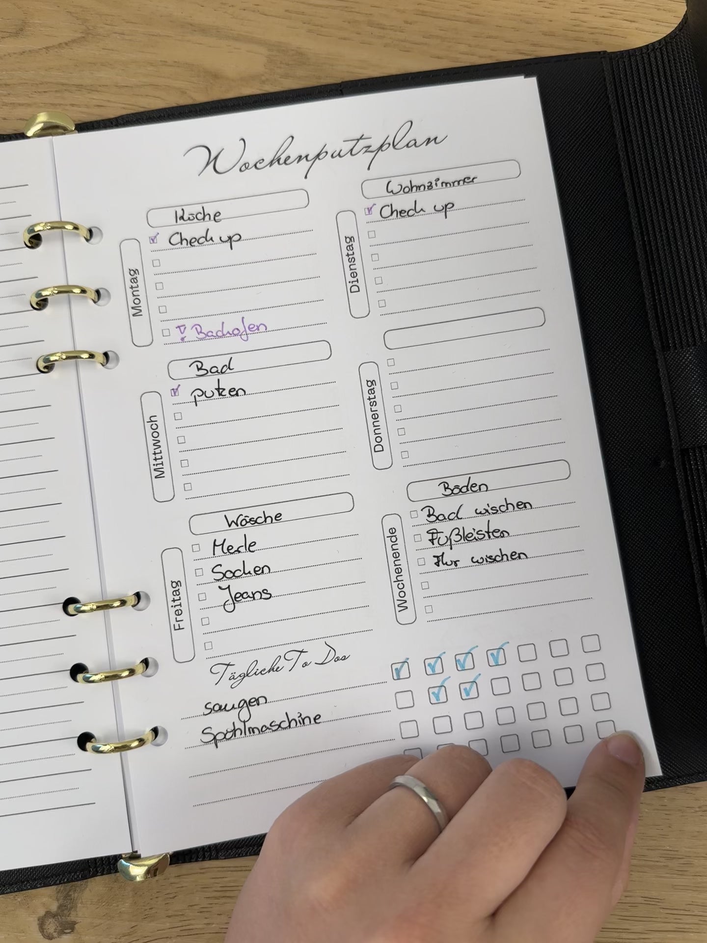 Jeder Tag ist übersichtlich gegliedert und bietet Platz für deine täglichen To-Dos – von schnellen 5-Minuten-Aufgaben bis hin zu größeren Reinigungsaktionen.
